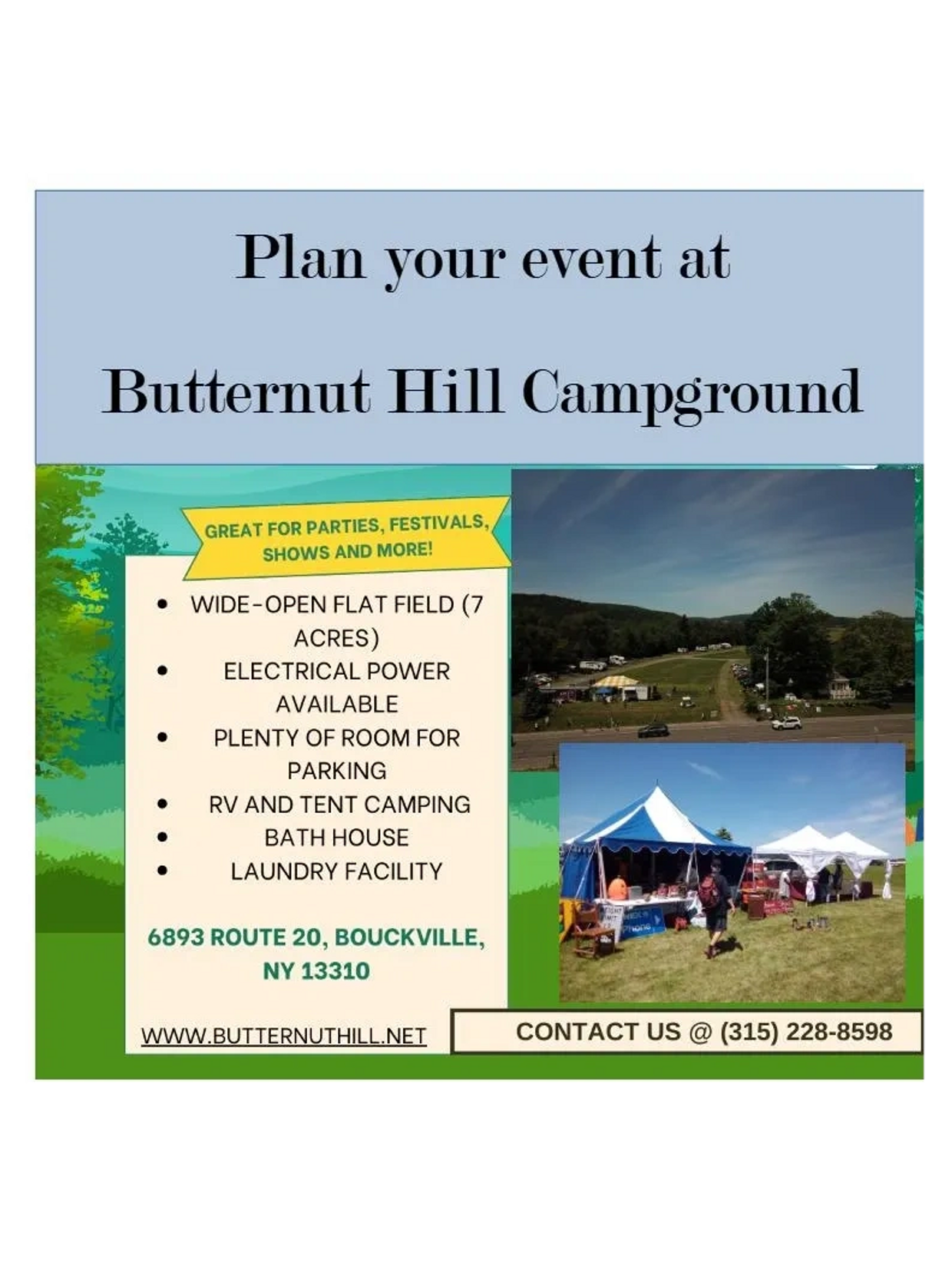 Butternut Hill RV Campground is located on historic Route 20 in picturesque Bouckville, NY., near Hamilton, Morrisville, Madison, Utica, Oriskany Falls, Cazenovia and other historic and idyllic communities. Enjoy the country setting, shop at the many antique shops in the area or visit the many nearby attractions, such as Colgate University, Chittenango Falls State Park and Turning Stone Casino. The campground offers electric and water hookups, a bath house, free Wi-Fi, a laundry facility, a dump station and pumpouts. Butternut Hill's camping season runs from May 15 to Oct. 15. Butternut Hill also hosts multiple events throughout the season, including the Madison-Bouckville antique shows and a fall craft fair and car show.